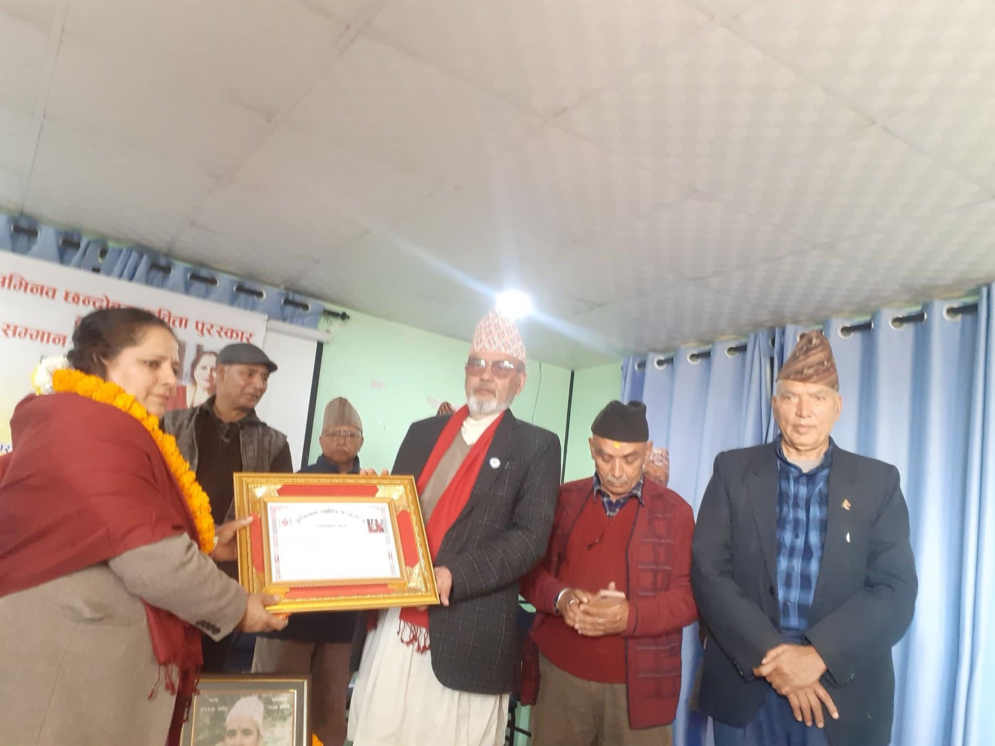 मंसिर २९। अभिनव साहित्य समाजले २७४ औ शृङ्खला अन्तर्गत बद्रिनाथ अभिनव छन्द कवि पुरस्कार तथा सम्मान अर्पण र कवि गोष्ठी सम्पन्न गरेको छ । उपाध्यक्ष विमल अर्यालको सभापतित्व, बमबहादुर थापा जितालीको प्रमुख आतिथ्य, विजय चालिसे, गा.न.पा. वडा नं.को अध्यक्ष नवराज लामा, शीतल गिरी, डिल्लीराज अर्याल, गंगा कर्माचार्य, रघुनाथ आचार्य, भाग्यशाली अधिकारी, बाजुराम पौड्याल, गंगाप्रसाद भेटवाल र पुरस्कृत व्यक्तित्व शान्ति सापकोटालगायतको विशेष आतिथ्य रहेको थियो । प्रमुख अतिथि तथा विशेष अतिथि र संस्थाका पदाधिकारीहरुले संयुक्त रुपमा कवि बद्रीनाथ आचार्यको तस्विरमा माला तथा पुष्पार्पण गर्दे बाल साहित्यकार तथा छन्द कवि श्री शान्ति सापकोटालाई नगद सात हजार सहित, सम्मानपत्र र दोसल्ला ओडाएर पुरस्कृत गरियो ।.प्रमुख अतिथि तथा अन्य विशेष अतिथिहरुले छन्द कवि बद्रिनाथ र पुरस्कृत व्यक्तित्वको विषयमा मन्तव्य राख्नुभएको थियो । शारदा पराजुलीको उद्घोषण, परशुराम पराजुलीको समीक्षा र मेनाका आचार्यको स्वागत मन्तव्यबाट सुरुभएको सो कार्यक्रममा, समाजका अध्यक्ष गोविन्दप्रसाद घिमिरेले धन्यवाद अर्पण र बद्रिनाथ र पुरस्कृत व्यक्तित्वको विषयमा मन्तव्य दिनुभएको थियो । उत्कृष्ट रचना वाचन गर्ने पुनम घिमिरे, विजया बस्नेत र दिवाकर न्यौपानेलाई प्रोत्साहनार्थ पुरस्कार प्रदान गरियो । रचना वाचनसमेत गरी सहभार्गीता जनाउनेहरुमा उध्वव रायमाझी, वसन्त रिजाल, गोपाल बराल, बाजुराम पौडेल, वासुदेव पौडेल, भावना न्योपाने, सुशील आचार्य, सरिता दुलाल घिमिरे, ठाकुर प्रसाद खतिवडा, सुमन पुडासैनी मित्र, नवराज पुडासैनी, ज्योत्स्ना, बि.पी. इलामे, वीरबहादुर लोहनी, ओम प्रसाद कोइराला, बद्री सुवेदी, कृपा पराजुली, मांगजुम थिंग, राजेशमान केसी, गायत्री कुमार आचार्य, सञ्जय सोती, सुरेशचन्द्र घिमिरे, पराशर रिजाल, लगायत ६१ जनाको उपस्थिति रहेको थियो ।