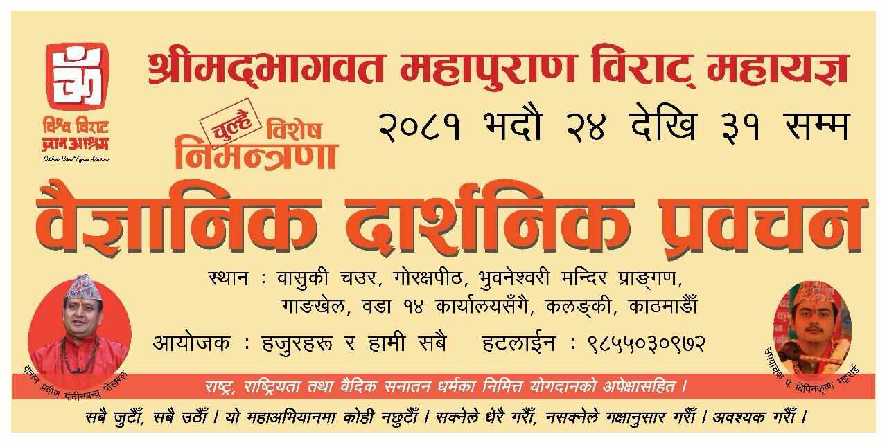 विश्व विराट ज्ञान आश्रमले ऐतिहासिक श्रीमद्भागवत महापुराण महायज्ञ सञ्चालन गर्ने भएको छ । यही भदौ २४ गतेदेखि ३१ गतेसम्म सप्ताहव्यापी महायज्ञ सञ्चालन हुने विश्व विराट ज्ञान आश्रमका सङ्गठन प्रमुख उद्धवकुमार घिमिरेले जानकारी दिए । वासुकीचौर गोरक्षपीठ भुवनेश्वरी मन्दिरको प्रांगणमा राष्ट्र राष्ट्रियता तथा वैदिक सनातन धर्मका निमित्त योगदानको अपेक्षा सहित उक्त कार्यक्रम संचालन गरिने प्रमुख घिमिरेले जनाए । महायज्ञमा प्रमुख वाचकका रूपमा वाचन प्रविण पं. दिनबन्धु पोखरेल रहनेछन भने पं. विपिनकृष्ण भट्टराई उपवाचक रहने छन् ।