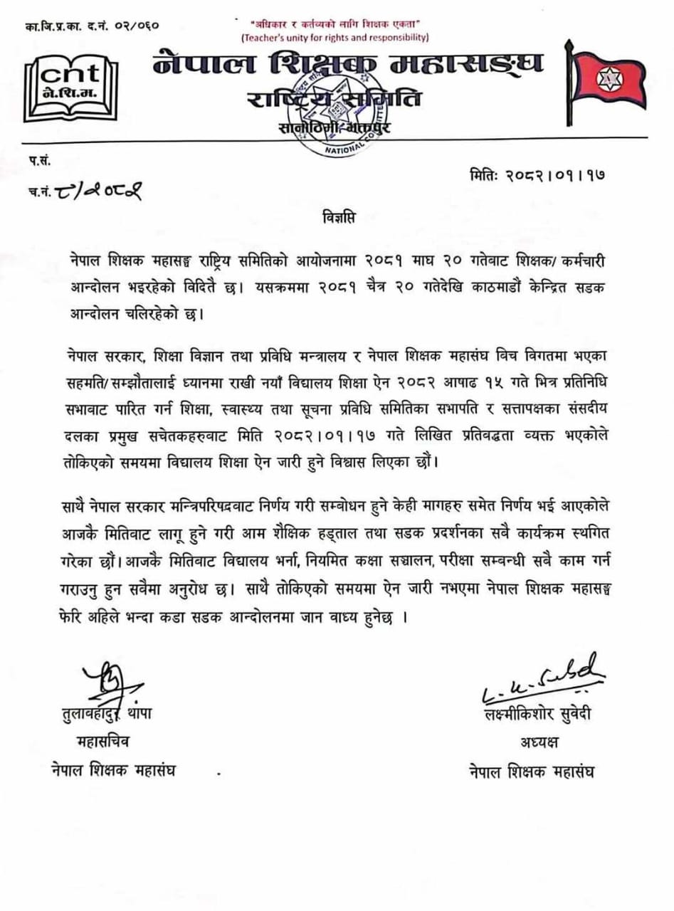 शिक्षक महासंघले विज्ञप्ति निकाल्दै समयमा ऐन जारी हुने विश्वाससहित आजकै मितिबाट विद्यालय भर्ना, नियमित कक्षा सञ्चालन, परीक्षासम्बन्धी सबै काम गर्न आग्रह गरेको छ ।