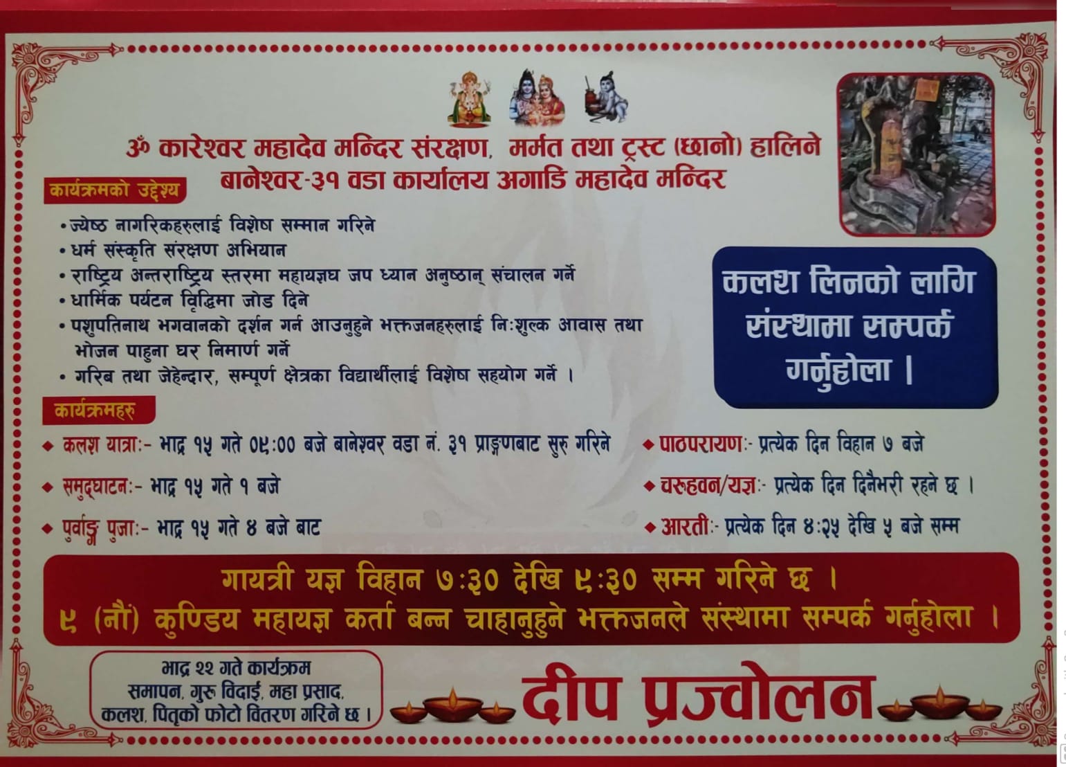 कलश लिन र यज्ञ कर्ता बन्ने इच्छुक भक्तजनले संस्थासँग सम्पर्क गर्न भनिएको छ।