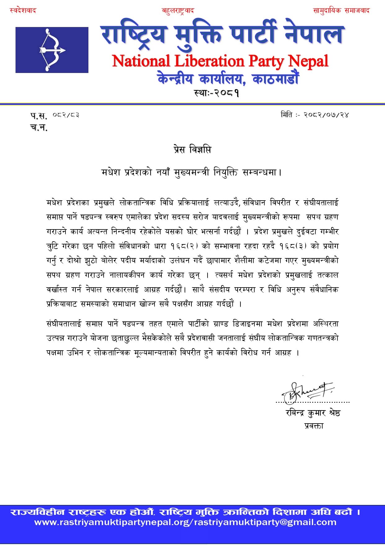 मधेश प्रदेशमा नयाँ मुख्यमन्त्रीको नियुक्ति र सपथ ग्रहण प्रक्रियाप्रति राजनीतिक दलहरूले तीव्र आपत्ति जनाएका छन्।