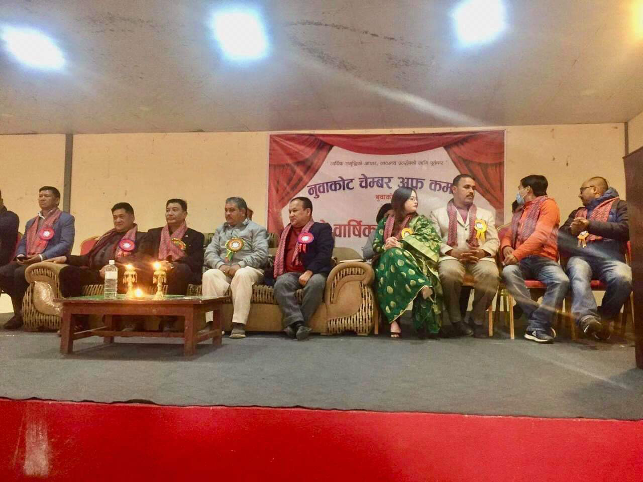 नुवाकोट, १६ माघ- नुवाकोट चेम्बर अफ कमर्सको दोश्रो वार्षिक साधारण सभा शुक्रबार सम्पन्न भएको छ । उक्त साधारण सभा नेपाल चेम्बर अफ कमर्सका अध्यक्ष राजेश काजी श्रेष्ठको प्रमुख आतिथ्यतामा सम्पन्न भएको हो । सो अवसरमा कार्यक्रमको उद्घाटन गर्दै अध्यक्ष श्रेष्ठले मुलुक अब संघीयतामा गएसँगै चेम्बरको सञ्जाल पनि उद्यम व्यवसायको विकास र नीतिगत बहस पैरवी, व्यावसायीको हक हितमा संलग्न रहनु पर्ने भएकाले प्रदेश, जिल्ला र नगरमा समेत जिल्ला चेम्बर अफ कमर्सको विस्तार गरिएको बताए । व्यवसायीहरुको हक हितका साथै सामाजिक सेवामा पनि चेम्बर सकृय रहेको समेत उनले उल्लेख गरे। नुवाकोटको स्थानिय उत्पादनलाइ बढाइ निर्यातलाई प्राथमिकता दिनुपर्ने र यहाँको ऐतिहासिक स्थलहरुलाइ पर्यटकीय गन्तव्य स्थलको रुपमा बिस्तार गर्न पर्नेमा उनले जोड समेत दिए ।
