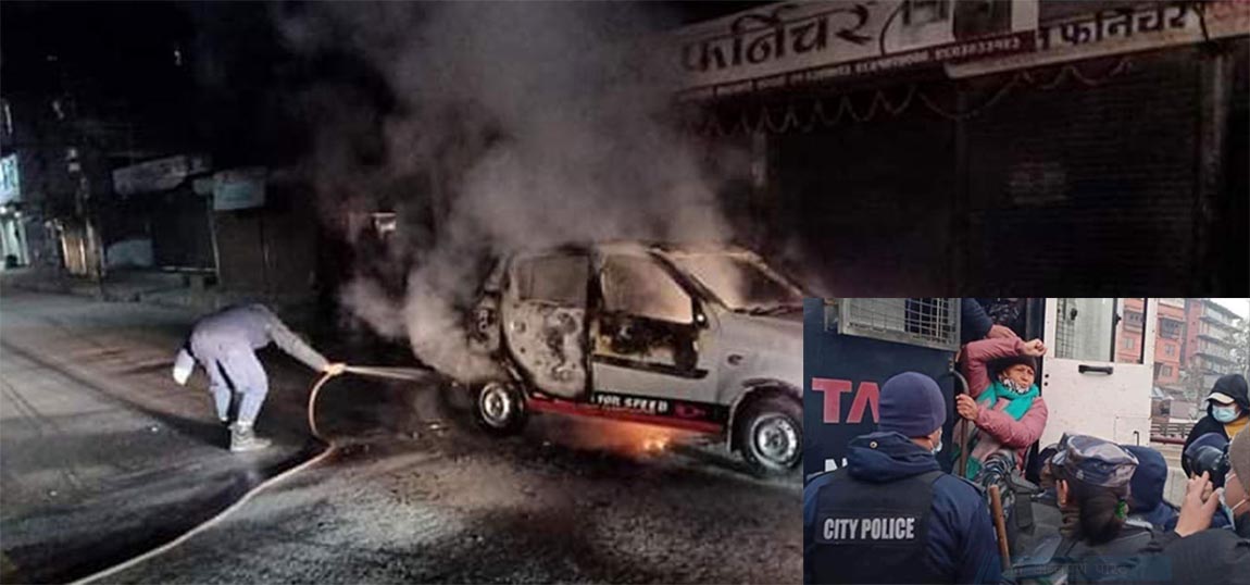 प्रदेश नम्बर ३–०१–००२ ज ५८८१ नम्बरको ट्याक्सीमाथि आगो लगायको हो। आगोबाट ट्याक्सीमा पूर्णरुपमा क्षति पुगेको छ।