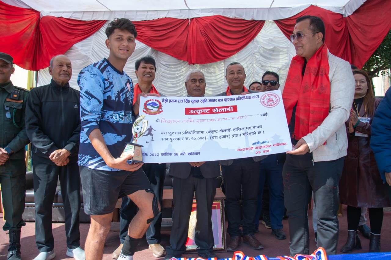 काठमाडौँ । तेस्रो प्रयोगराज सिंह सुवाल अन्तरवडा फुटसल प्रतियोगितामा वडा नम्बर १३ को टीम विजेता बनेको छ । लैनचौर फुटसल मैदानमा कार्तिक २२ गते देखि सुरु भएको खेलको फाइनलमा आज वडा नं. ४ को समूहलाई पेनाल्टी गोलबाट हराएर वडा १३ को टीम विजेता भएको हो । निर्धारित समयमा दुवै टीमले गोल नगरेपछिको पेनाल्टीमा वडा नम्बर १३ ले २–० गोल अन्तरले उपाधि हासिल गरेको हो । उपाधिसँगै विजेता टोली वडा नं. १३ ले २ लाख रुपियाँ प्राप्त गर्यो । उपविजेता वडा नं. ४ ले १ लाख रुपियाँ पुरस्कार प्राप्त गर्यो । वडाध्यक्ष एवं महानगरपालिकाको विधायन समितिका संयोजक मचाराजा महर्जन, खेलका संयोजक गोपाल नापितले विजेताहरुलाई पुरस्कार, ट्रफी तथा प्रमाण पत्र प्रदान गर्नुभएको थियो ।