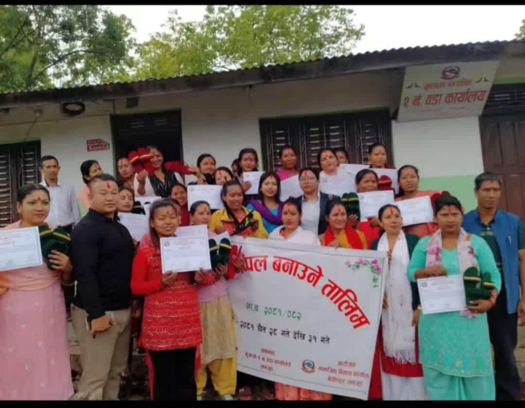 लम्जुङ — सुन्दरबजार नगरपालिकाकाे वडा नं. २ र सामाजिक विकास कार्यालयकाे संयुक्त समन्वयमा सञ्चालन भएको चप्पल बनाउने सीपमूलक तालिमको समापन एक विशेष समारोहकाे बीच सम्पन्न भएको छ। स्थानीय स्तरमै रोजगारी सिर्जना गर्ने उद्देश्यले सञ्चालन गरिएको उक्त तालिमको समापन कार्यक्रममा प्रमुख अतिथि सुन्दरबजार नगरपालिका–२ का वडाध्यक्ष नवीन कुमार श्रेष्ठ रहनु भएको थियो। कार्यक्रममा अध्यक्षता सामाजिक विकास कार्यालयकी प्रमुख मिता कुमारी थापाले गर्नुभएको थियो भने कार्यक्रम सञ्चालन सिर्जना पौडेलले गर्नु भएको थियो। समापन समारोहमा वडाध्यक्ष गुरुङले सीप आधारित तालिमहरू महिलाहरूको आत्मनिर्भरता र उद्यमशीलताका लागि महत्वपूर्ण हुने बताउँदै यस्ता कार्यक्रमको निरन्तरताका लागि नगरपालिकाले आवश्यक सहयोग गर्दै जाने प्रतिबद्धता व्यक्त गर्नु भयो। तालिममा स्थानीय महिलाहरूको उल्लेखनीय सहभागिता रहेको थियो। सहभागीहरूले तालिमबाट सिकेका सीपहरू भविष्यमा उपयोग गर्दै आफ्नै साना व्यवसाय सुरु गर्ने योजनाबारे उत्साहपूर्वक अभिव्यक्ति दिएका थिए। कार्यक्रमको अन्त्यमा सहभागीहरूलाई प्रमाणपत्र वितरण गर्दै सफलताको शुभकामना व्यक्त गरिएको थियो।