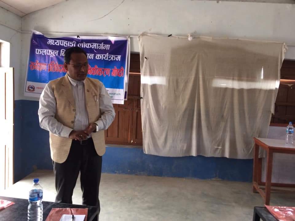 लमजुङ । राइनास नगरपालिका वडा नं ८ मा मध्यपहाडि लोकमार्गमा हरियालीका लागि फलफुल रोपण कार्यक्रमको फिल्ड सर्भे प्रतिवेदन सार्वजनिकिकरण आज सम्पन्न भयो । राइनास नगर प्रमुख सिंह बहादुर थापाको प्रमुख आतिथ्यतामा भएको कार्यक्रमको अध्यक्षता वडा नं ८ का वडा अध्यक्ष कृष्णप्रसाद लामिछानेले गर्नु भएको थियो ।यस कार्यक्रम जनता को सक्रियतामा सफल हुने हुनाले सबैले सक्रियताका साथ लाग्नु हुन अनुरोध गर्दै नगर पालिकाका तर्फबाट पुर्ण सहयोग गरिने नगर प्रमुख थापाले बताउनु भयो ।कार्यक्रममा उप प्रमुख धनकुमारि गुरुंग , प्रमुख प्रसाशकिय अधिकृत रामचन्द्र अधिकारी ज्युको विशेष आतिथ्यता थियो ।