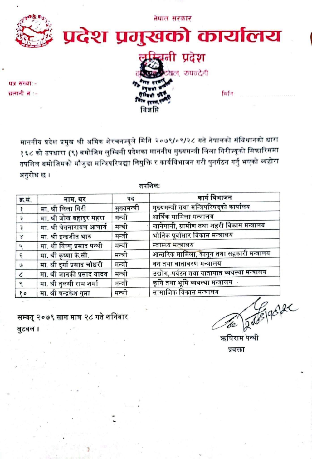 २९ माघ,रूपन्देही — लुम्बिनी प्रदेशका मुख्यमन्त्री लीला गिरीले मन्त्रिपरिषद् विस्तार गरेका छन् । मुख्यमन्त्री गिरिको सिफारिसमा प्रदेश प्रमुख अमिक शेचरनले थप ७ मन्त्री नियुक्त गर्दै मन्त्रिपरिषद् पुनर्गठन गरेका छन् ।